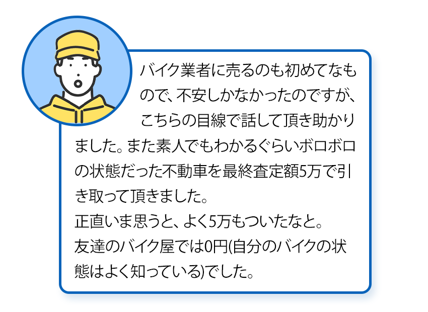 廃車するしかないバイクでもマイナス査定はなく安心です。